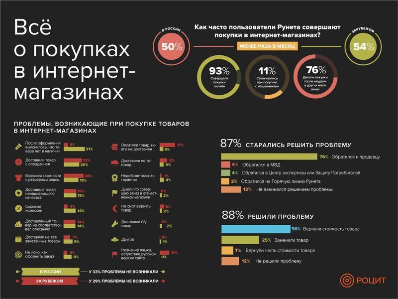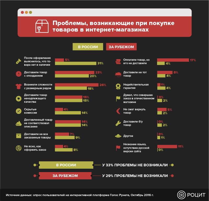 При совершении покупок в отечественных интернет-магазинах более 30% уже после оформления заказа выяснили, что его нет в наличии, 21% получил товар с опозданием, а у 18% возникли сложности с размерным рядом при покупке обуви или одежды (при покупках в иностранных интернет-магазинах эта проблема встречается в 2 раза чаще).