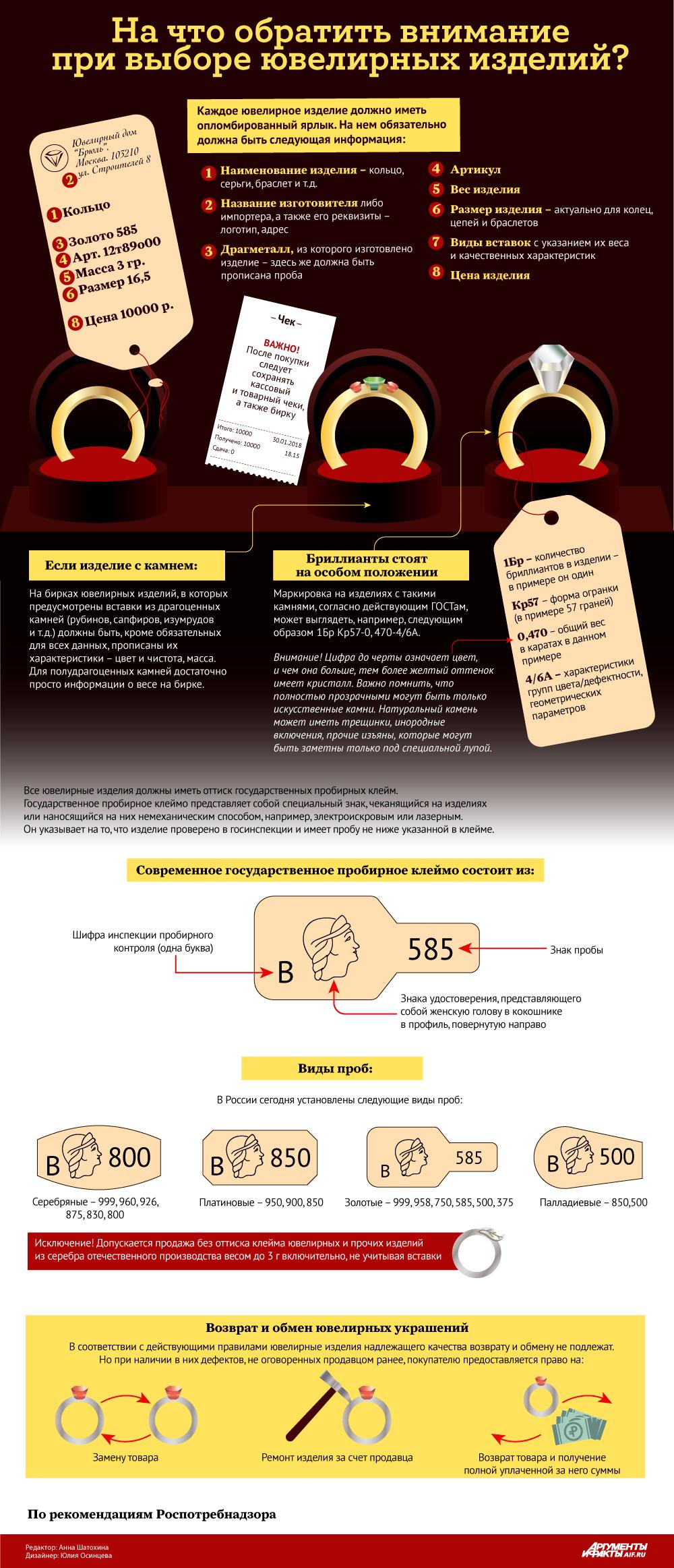 При покупке ювелирного украшения, внимательно осмотрите его, найдите оттиск пробирного клейма и именник завода-изготовителя (в случае если речь идет о ювелирной продукции отечественного производителя). Если изделие импортного производства, то именник может отсутствовать, но оттиск клейма инспекции пробирного надзора установленного образца должен присутствовать обязательно!