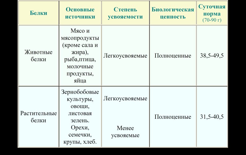 В таблице 1 представлена общая характеристика белков животного и растительного происхождения.