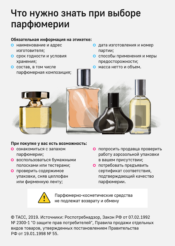 При продаже парфюмерной продукции продавец должен соблюдать требования Закона РФ от 07.02.1992 № 2300-1 «О защите прав потребителей» (далее – Закон о защите прав потребителей) и Правил продажи отдельных видов товаров, утвержденных постановлением Правительства РФ от 19.01.1998 № 55.